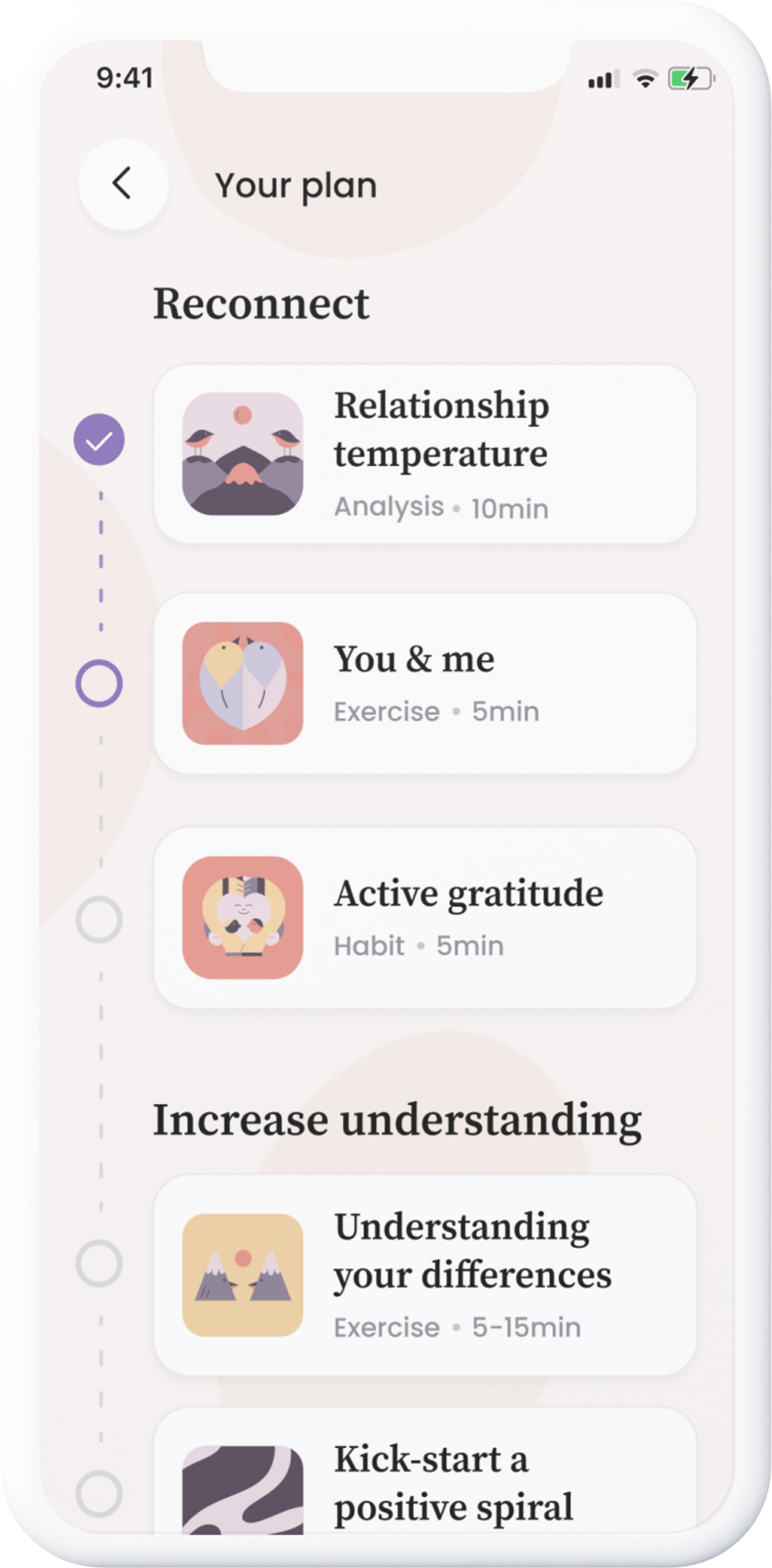 Follow your recommended plan of exercises, quizzes, and articles, meticulously crafted to deepen your emotional connection and repair relationship issues.