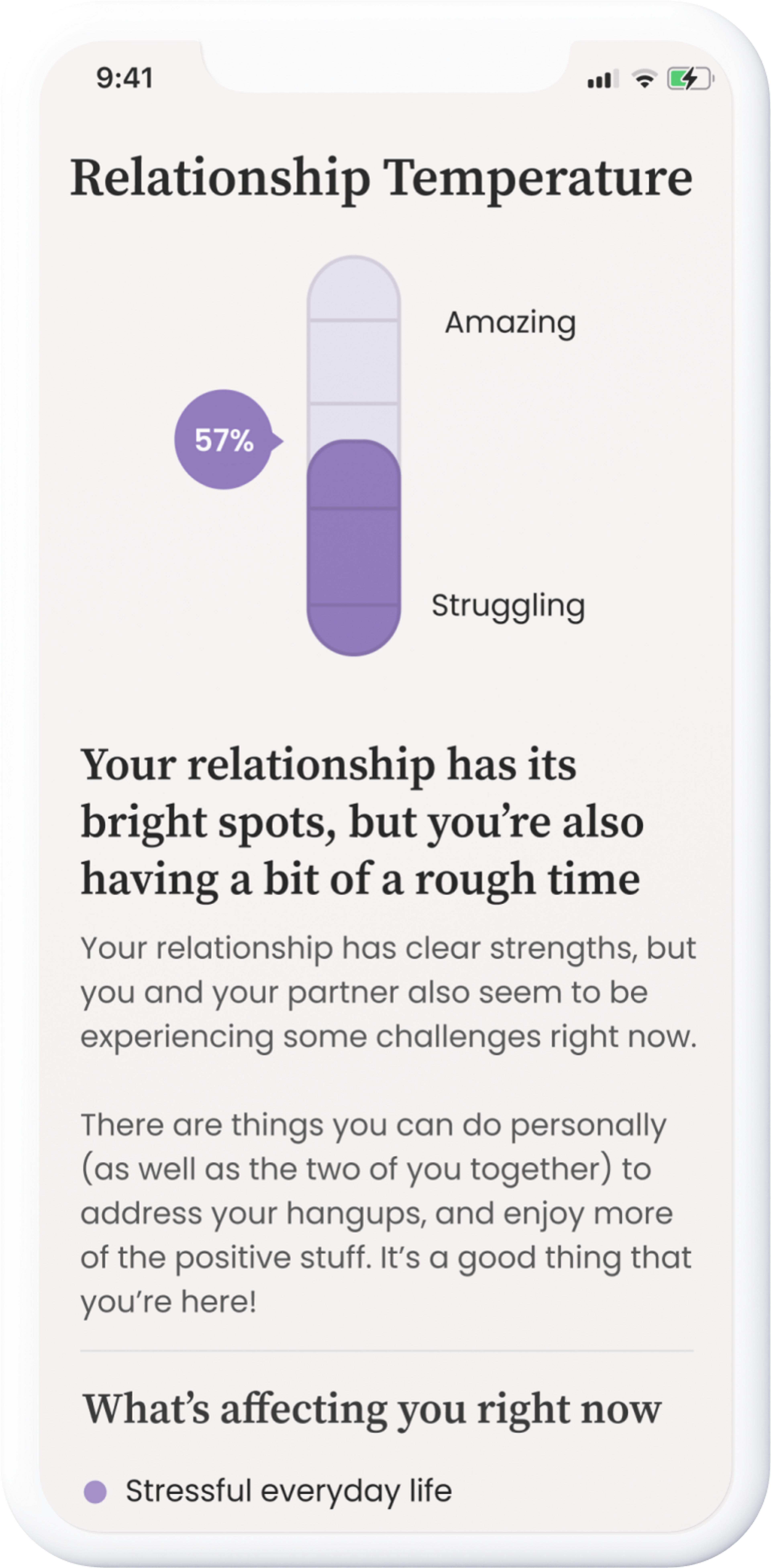 Find out what your relationship needs right now. What are your strengths and challenges as a couple? Keep tabs on your journey with regular check-ins.